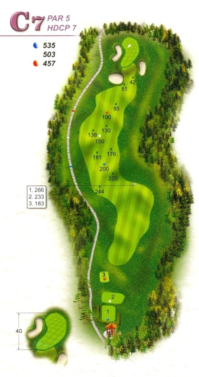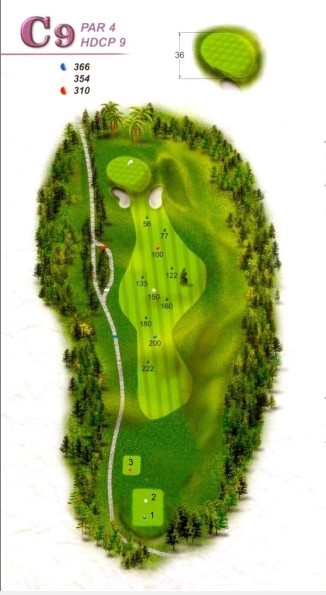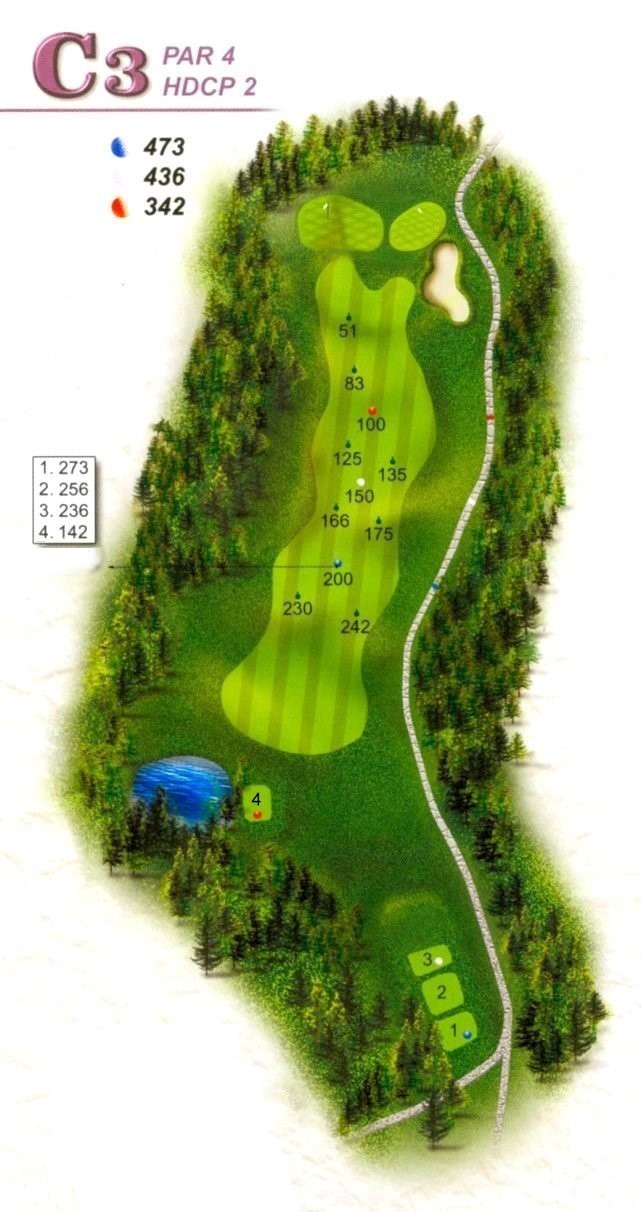 | 本球道「直」「長」「遠」,開球慎防左曲球掉入樹林邊坡內;右側為處罰區損失一桿,鐵桿準確度應提高才能在此洞打個標準桿。 |