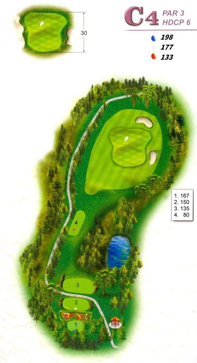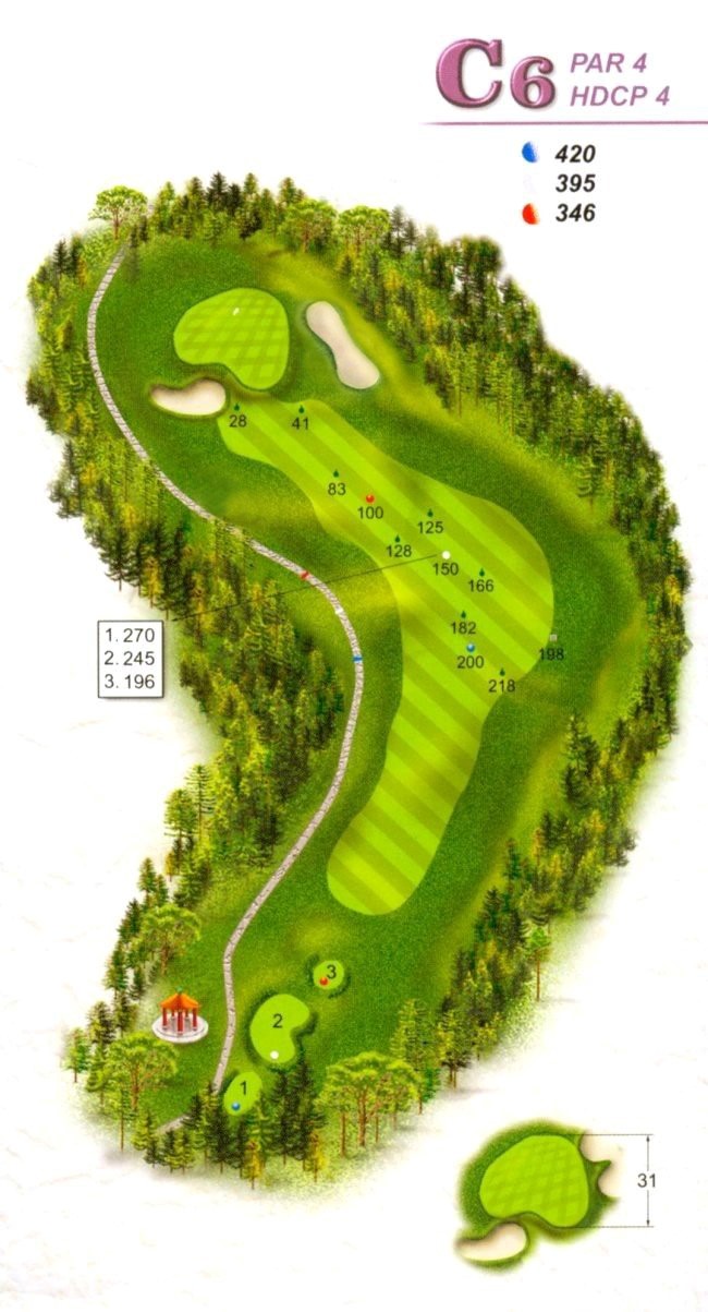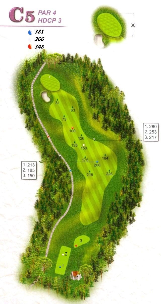 本洞因地形之關係,使球道呈將近90度之左狗腿洞,左側處罰區與鄰洞落差太大,建議開球用球道木桿或長鐵桿為佳,落點剛好在轉角處;第二桿用長鐵桿或中鐵桿,但小心果嶺前之大沙坑,挑戰性高。 |