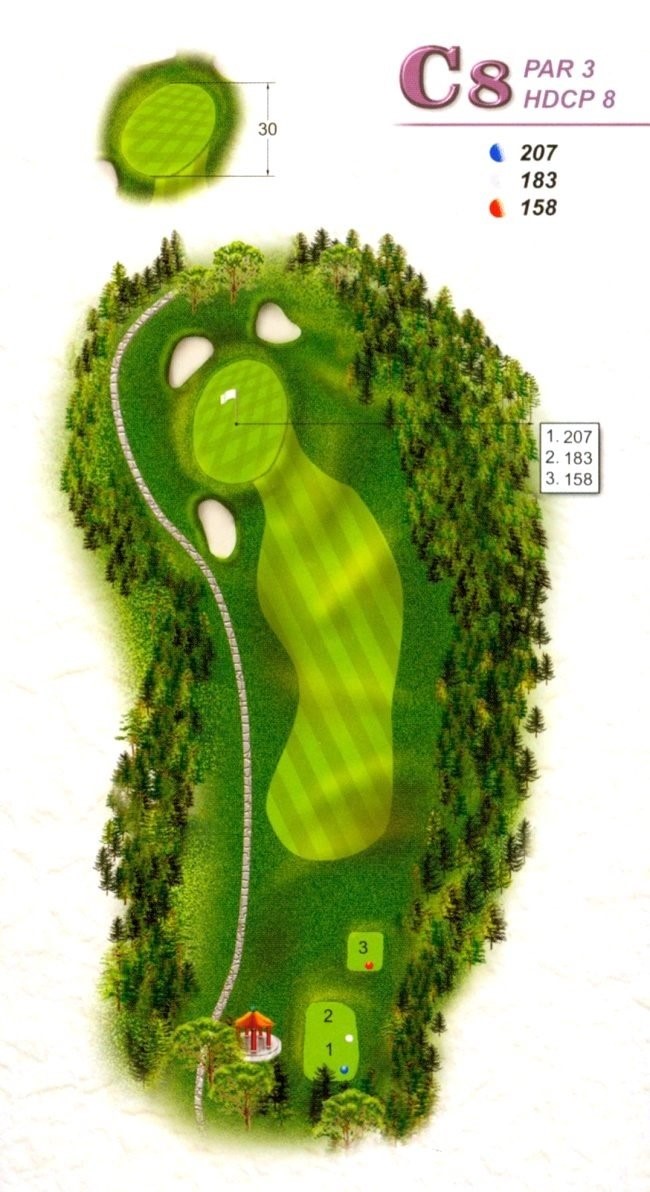 | 本洞左側全線設處罰區,右側邊坡高處也設有OB;第一桿開球落點寬大,盡可能大幅揮桿;第二桿宜中間稍右側用球道木桿或長鐵桿;第三桿用挖起桿送上果嶺,此洞果嶺雖大,小心三推及果嶺前左右側之沙坑。 |