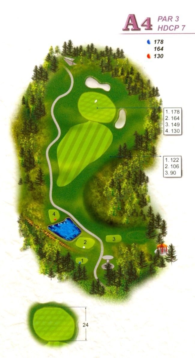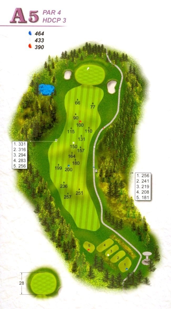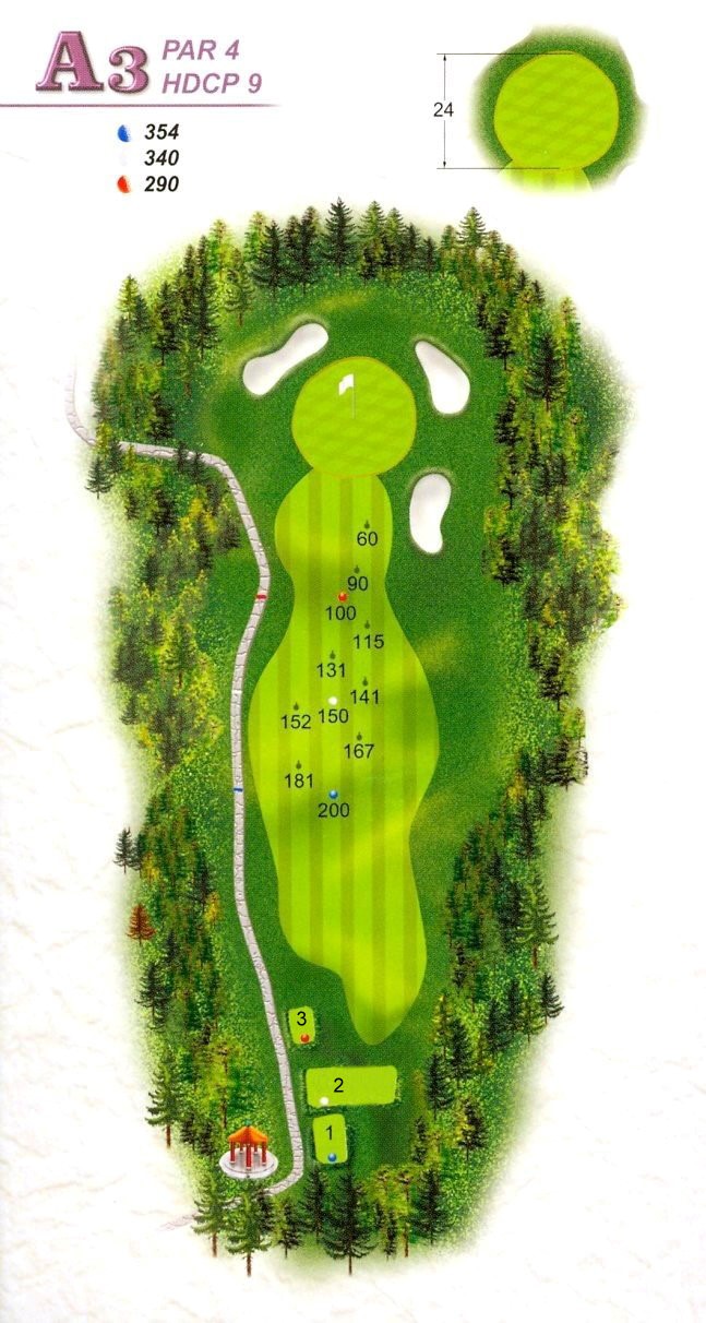 | 本洞右側均為OB,開球時需靠左側中間為佳;靠近果嶺140碼處為下坡,球容易往右滾動,果嶺較硬,容易滾到後方長草及兩側沙坑。 |
