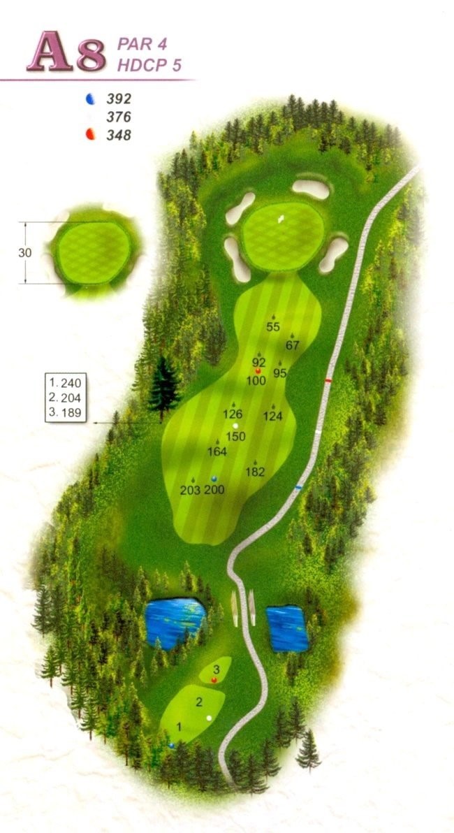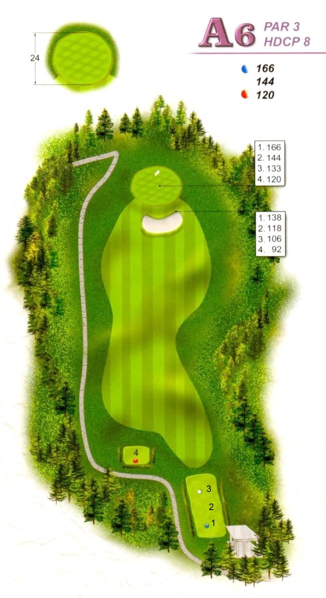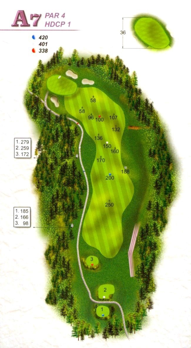 | 本洞A區九洞之中最難打的一洞,開球除看不到果嶺外,左側均為OB,右側邊坡雖會滾下,但距離果嶺太遠,第二桿不容易打上果嶺;果嶺左前及右側有沙坑,要想在此洞打PAR,第一桿非要盡力揮桿不可。 |