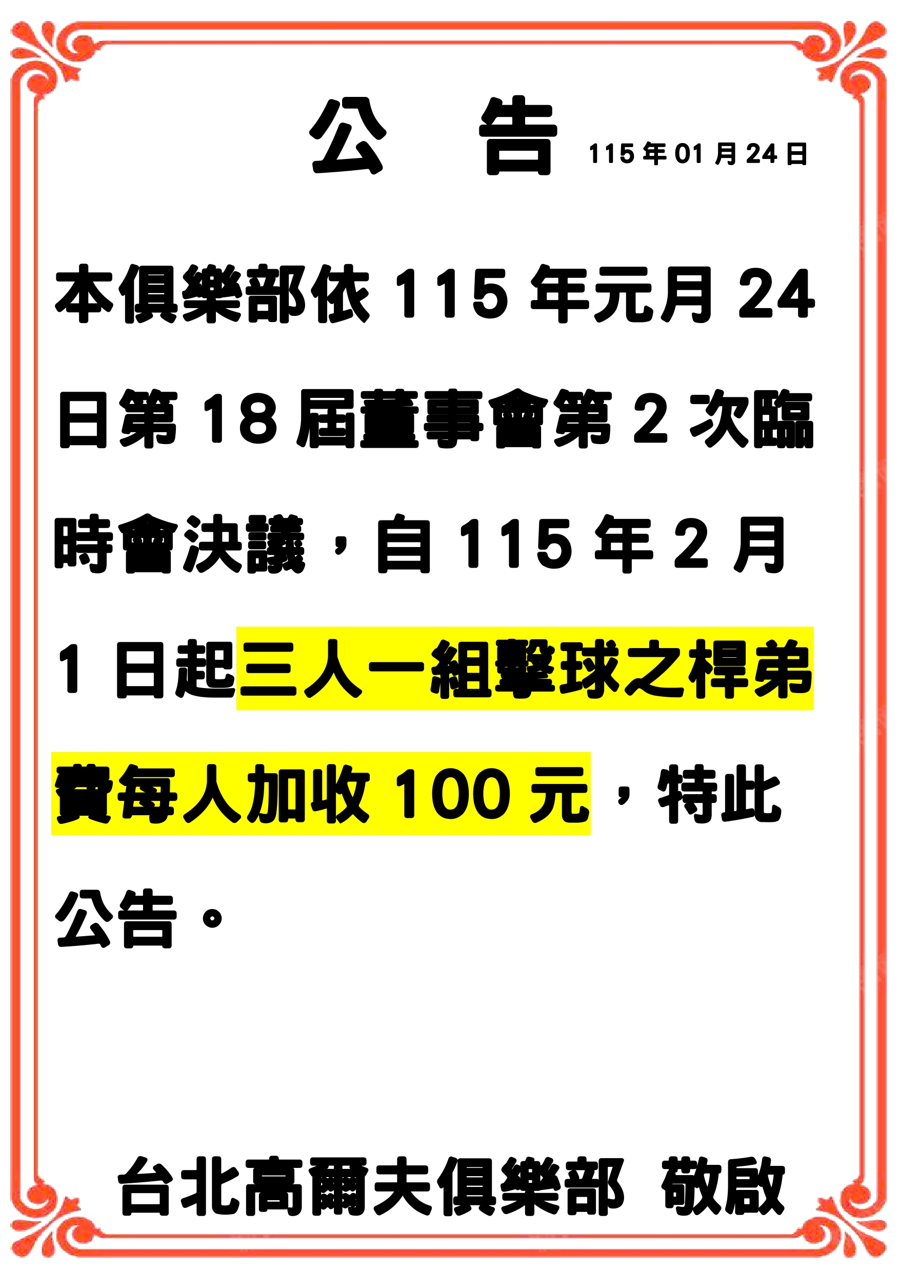因應物價調漲及中央政府自111年起軍公教人員調薪政策,本俱樂部原4球客1桿弟時減收100元桿弟費之收費模式,業經董事會決議:自111年01月01日起不再減收,特此公告。
