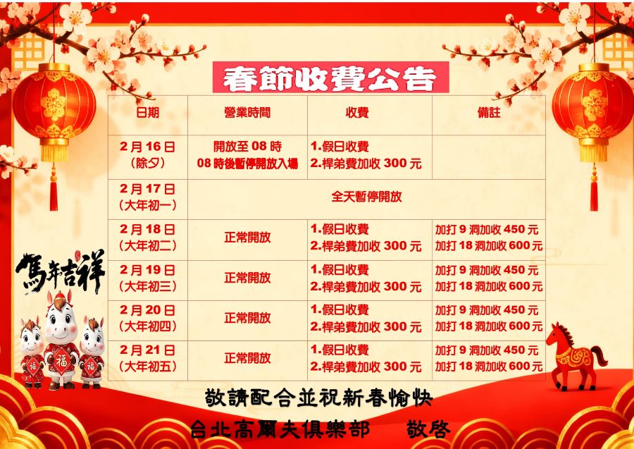 二、2月16~17日除夕、大年初一全場關閉場區(練習場、短九洞、練習切推區)。